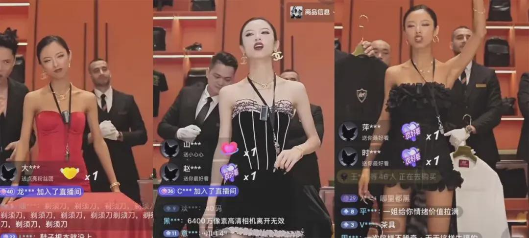 她的直播间装修成一片“爱马仕橙”,一字排开的西装保镖站在身后,自己身上则不是皮草就是华丽礼裙。
